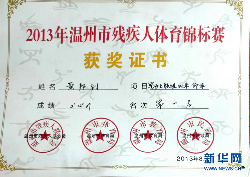 2013年,“阿勇哥”參加了溫州市殘疾人體育錦標(biāo)賽,獲男子上肢組100米仰泳第一名。