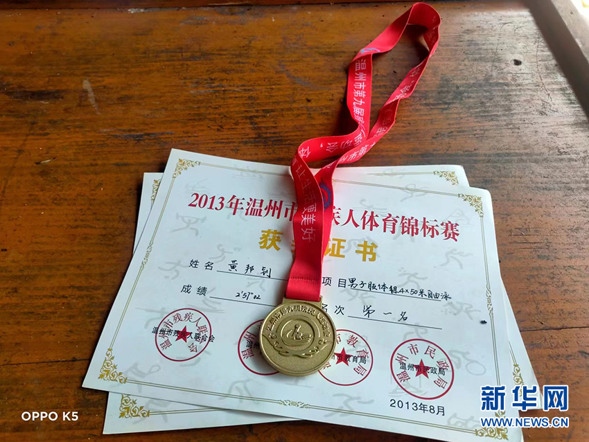 “阿勇哥”參加2013年溫州市殘疾人體育錦標(biāo)賽獲得的證書、獎牌。