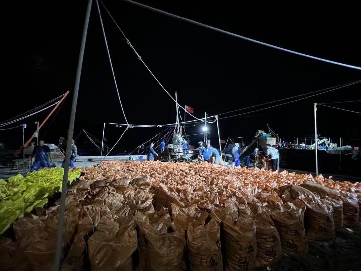 在臺(tái)風(fēng)來臨前,舟山市嵊泗縣枸杞鄉(xiāng)后頭灣碼頭格外忙碌,一艘艘滿載著貽貝的養(yǎng)殖漁船陸續(xù)歸來。碼頭上,吊車正抓緊時(shí)間將一個(gè)個(gè)沉甸甸的養(yǎng)殖籠吊運(yùn)上岸。為最大程度降低貽貝養(yǎng)殖戶受災(zāi)損失,當(dāng)?shù)匮杆俳M織人員,第一時(shí)間奔赴碼頭,協(xié)助養(yǎng)殖戶開展貽貝搶收工作。