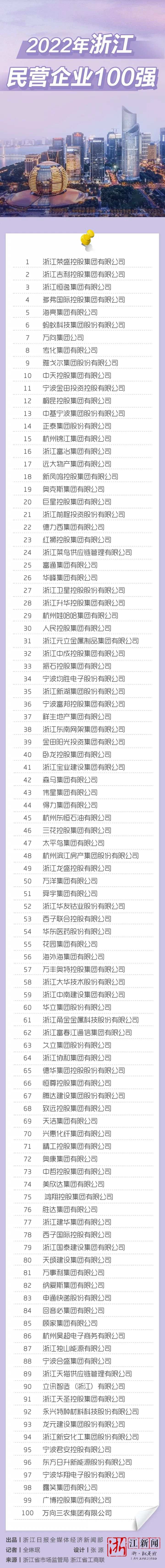 9月13日,浙江省市場監(jiān)管局、浙江省工商業(yè)聯(lián)合會對外公布“2022年浙江省民營企業(yè)100強”榜單。(榜單詳情見文末)