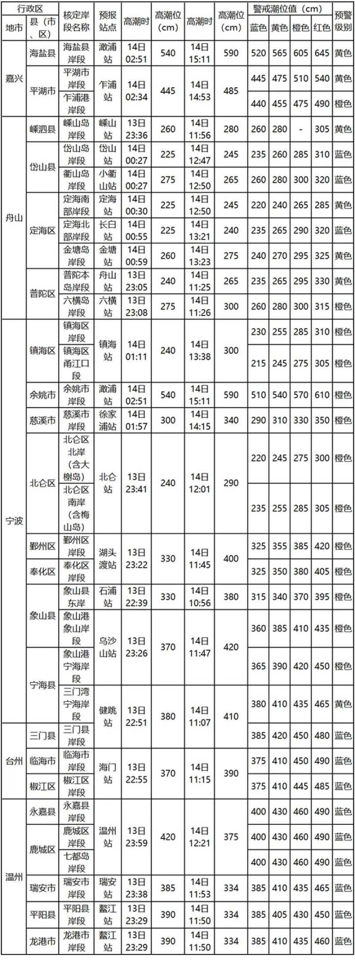 近岸海域:嘉興有1.6米到2.5米的中到大浪,明天下午增大到2.0米到3.0米的中到大浪;舟山有2.5米到3.5米的大浪,明天下午增大到4.0米到6.0米的巨到狂浪;寧波、臺(tái)州有3.0米到4.0米的大到巨浪,明天上午增大到4.0米到6.0米的巨到狂浪;溫州有3.0米到4.0米的大到巨浪,明天上午增大到3.5米到5.0米的大到巨浪。近岸海域海浪預(yù)警級(jí)別為紅色。