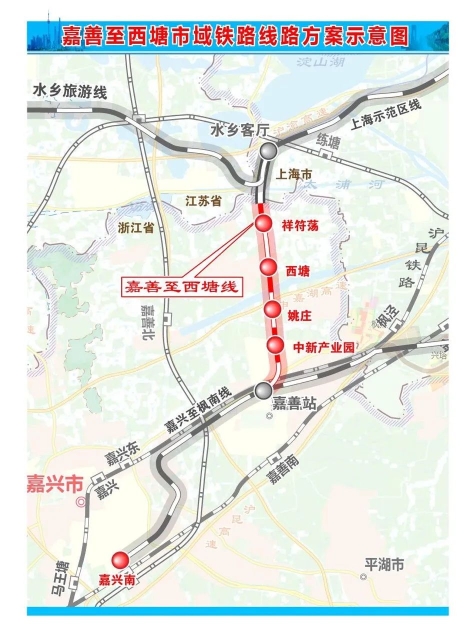 項(xiàng)目起自嘉興至楓南市域鐵路嘉善站(不含),途經(jīng)中新產(chǎn)業(yè)園、姚莊、西塘等,止于浙滬省界,全長(zhǎng)20.4公里,均在嘉善境內(nèi),設(shè)中新產(chǎn)業(yè)園、姚莊、西塘、祥符蕩4座高架站。