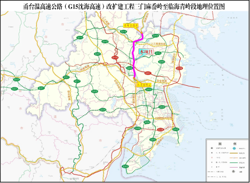 甬臺(tái)溫高速公路改擴(kuò)建工程三門(mén)麻岙嶺至臨海青嶺段項(xiàng)目起點(diǎn)位于甬臺(tái)交界的三門(mén)縣珠岙鎮(zhèn),設(shè)麻岙嶺隧道與甬臺(tái)溫高速改擴(kuò)建工程寧波段相接,路線(xiàn)總體呈自北向南走向,經(jīng)過(guò)三門(mén)縣、臨海市,改造珠岙、吳岙兩處樞紐分別連接三門(mén)聯(lián)絡(luò)線(xiàn)、常臺(tái)高速,改造三門(mén)、臨海北兩處互通,在臨海市邵家渡街道新增邵家渡互通連接351國(guó)道,項(xiàng)目終點(diǎn)位于臨海市沿江鎮(zhèn),接甬臺(tái)溫高速改擴(kuò)建工程臨海青嶺至溫嶺大溪嶺段。路線(xiàn)總長(zhǎng)約42.8公里,總體采用雙向八車(chē)道高速公路標(biāo)準(zhǔn),設(shè)計(jì)速度100公里每小時(shí)。