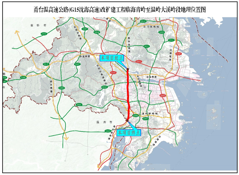 臨海青嶺至溫嶺大溪嶺段項(xiàng)目起點(diǎn)位于臨海市沿江鎮(zhèn),與甬臺(tái)溫高速改擴(kuò)建工程三門(mén)麻岙嶺至臨海青嶺段相接,路線(xiàn)總體呈自北向南走向,經(jīng)過(guò)臨海市、黃巖區(qū)、溫嶺市,改造利用水洋、大溪兩處樞紐分別連接臺(tái)金高速、溫嶺聯(lián)絡(luò)線(xiàn);原址改造臨海南、臺(tái)州、溫嶺西三處互通;在黃巖區(qū)高橋街道新增南城互通;移址改建既有臺(tái)州南互通,與新增服務(wù)區(qū)合址建設(shè),項(xiàng)目終點(diǎn)位于溫嶺市大溪鎮(zhèn),在大溪嶺-湖霧嶺隧道內(nèi)接甬臺(tái)溫高速改擴(kuò)建工程溫州段。路線(xiàn)總長(zhǎng)約40.2公里,總體采用雙向八車(chē)道高速公路標(biāo)準(zhǔn),設(shè)計(jì)速度100公里/小時(shí)。