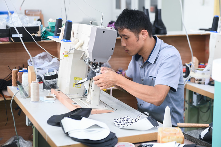 9月27日,在諸暨市姚江鎮(zhèn)一家鞋業(yè)企業(yè)內,工人在打樣新款鞋子。