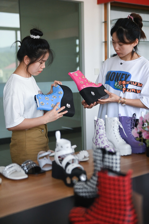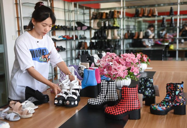 9月27日,在諸暨市姚江鎮(zhèn)一家鞋業(yè)企業(yè)內,工作人員在查看一批完成設計打樣即將批量生產的女鞋,該企業(yè)的外貿訂單生產計劃已經排到了年底。