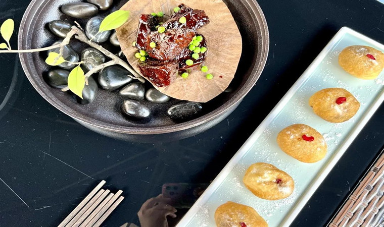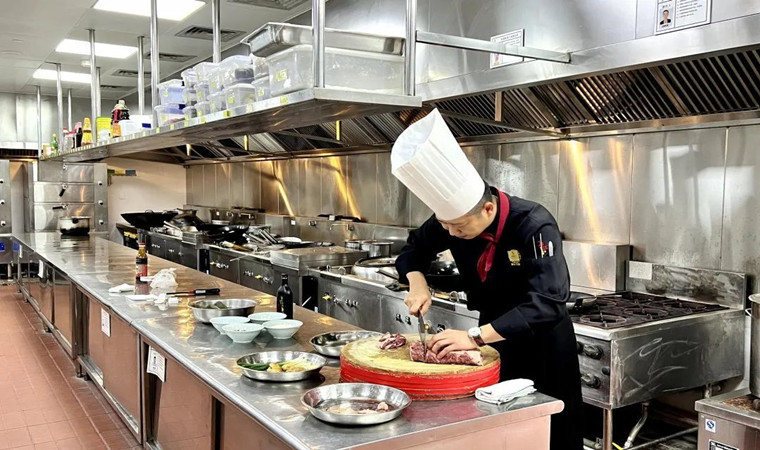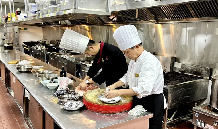 朱偉一邊備菜,一邊向記者介紹:“在烹制牛肉時(shí),我們要加入桐鄉(xiāng)本地的‘烏酒’和包裹粽子的‘箬竹葉’,這樣烹制出來的牛肉,肉香醇厚,食者唇齒間酒香、粽香縈繞,是一道具有獨(dú)特烙印的桐鄉(xiāng)美食?!庇浾吡私獾剑唆障銥蹙菩∨H?,還有許多桐鄉(xiāng)特色美食也出現(xiàn)在菜單中——紅燒老鵝、富貴燜喜蛋、羊肉面、定勝糕、桐鄉(xiāng)爆魚……