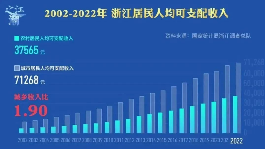 1月19日,國家統(tǒng)計(jì)局浙江調(diào)查總隊(duì)公布:2022年,浙江城鄉(xiāng)居民收入比1.90,比上年再次縮小0.04。從十年前的2.37,到如今1.90,連續(xù)呈現(xiàn)縮小態(tài)勢。