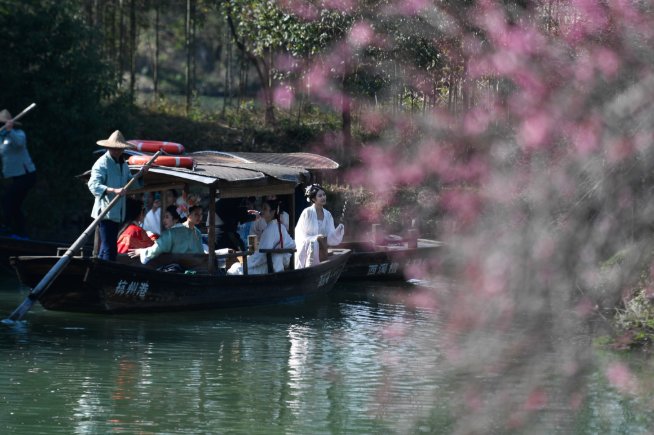 漢服愛(ài)好者在杭州西溪國(guó)家濕地公園乘坐搖櫓船賞梅。新華社記者 黃宗治 攝