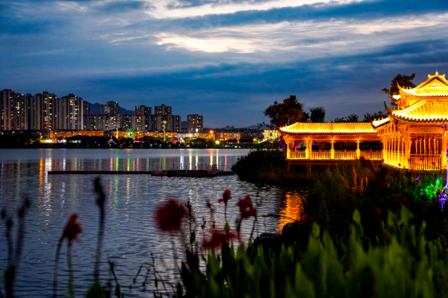 入夜,數(shù)萬(wàn)名市民來(lái)到重慶市漢豐湖畔,或在明亮的濱湖廣場(chǎng)載歌載舞,或在綠樹(shù)圍繞的環(huán)湖步道上散步、騎行,或帶著孩子在湖邊的沙池中嬉戲。