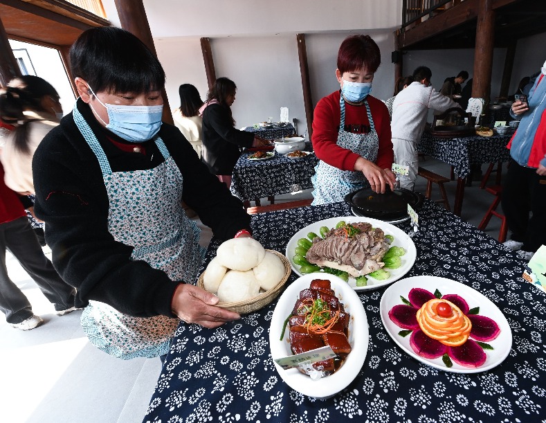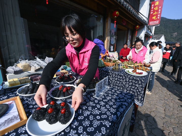3月3日,湖源鄉(xiāng)的民宿經(jīng)營者們把烹飪好的特色美食擺放好,參加鄉(xiāng)村美食技能比拼。