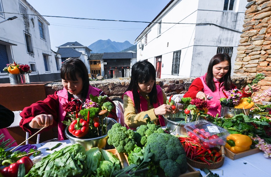 3月3日,湖源鄉(xiāng)的巾幗志愿者用鮮花和蔬菜制作特色插花,用于裝飾民宿餐廳。