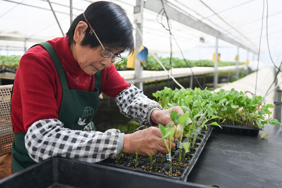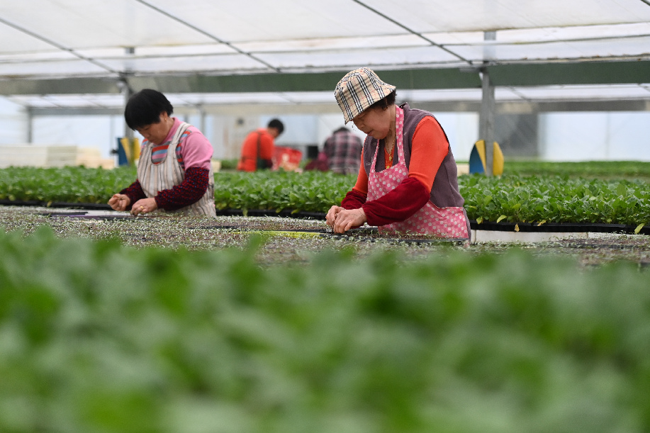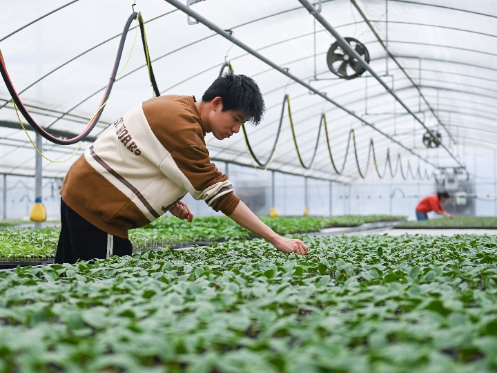 3月8日,工作人員在杭州市臨平區(qū)的杭州康成農(nóng)業(yè)科技有限公司的溫室內(nèi)查看菜苗長勢。