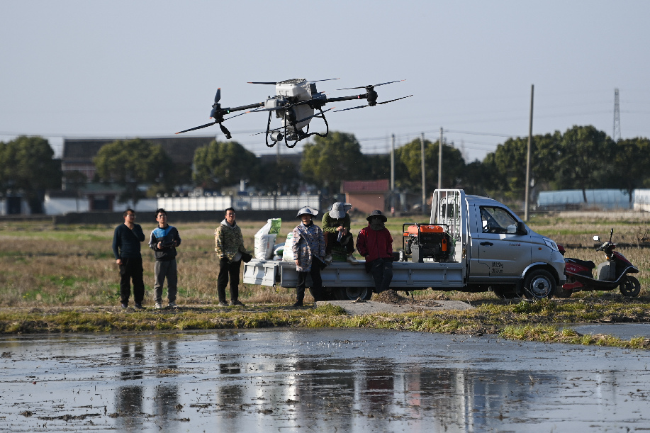 種糧戶在寧波市奉化區(qū)西塢街道四維村的水稻秧田操控植保無人機(jī)施肥(3月7日攝)。