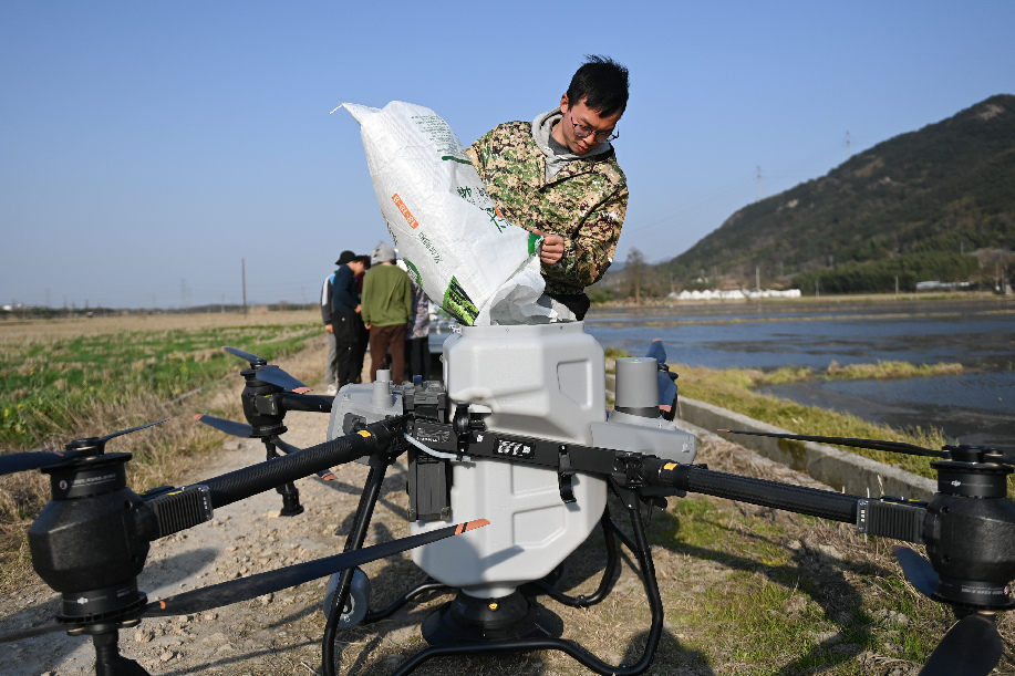 在寧波市奉化區(qū)西塢街道四維村,種糧戶將肥料倒入植保無人機(jī)的裝置中(3月7日攝)。