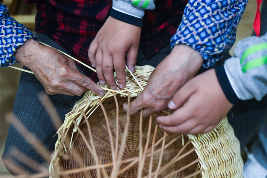 5月9日,東林鎮(zhèn)第二小學(xué)的學(xué)生向柳編藝人學(xué)習(xí)柳編技藝。