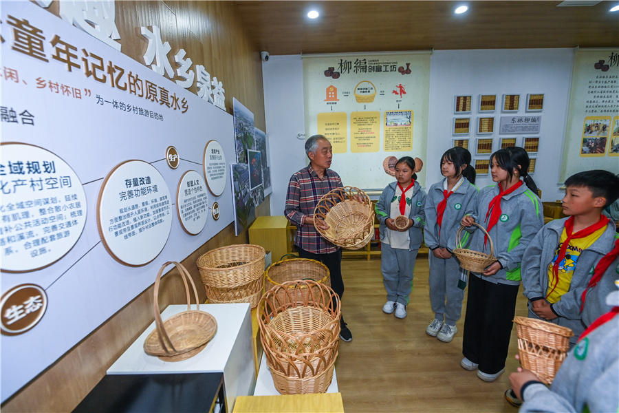 5月9日,柳編藝人、黨員沈柏根(左一)在給東林鎮(zhèn)第二小學(xué)的學(xué)生講述柳編制品的工藝和歷史。
