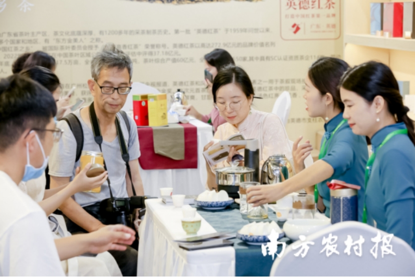 各地茶客在清遠(yuǎn)英德紅茶展位品茗。
