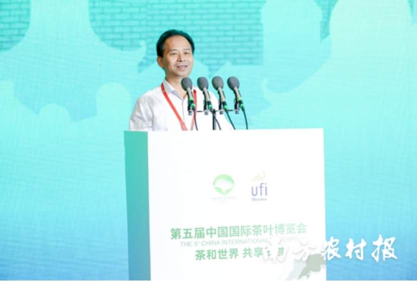 清遠(yuǎn)市農(nóng)業(yè)農(nóng)村局四級調(diào)研員鐘有恒在“廣東百縣共慶‘國際茶日’與共品 廣東好茶專場活動”推介英德紅茶。