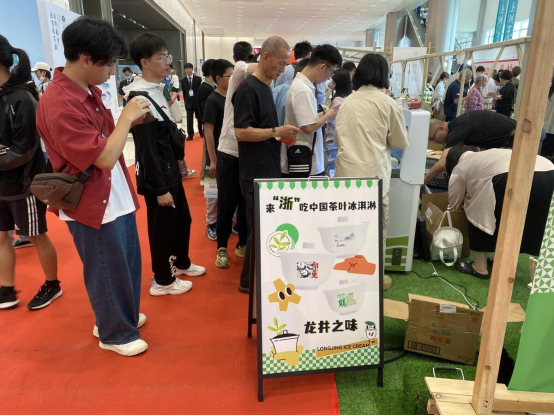 “這個(gè)抹茶冰淇淋球裝在一個(gè)小茶碗里,吃起來特別有儀式感?!眮碜园不盏男桥c朋友最近正好在杭州旅游,聽說有茶博會(huì),想來“逛吃逛吃”,所以一大早特地趕了過來?!耙郧爸宦犝f過咖啡機(jī),這里我第一次看到萃茶機(jī),溫度、水量等等還都可以調(diào)節(jié)?!毙潜硎?,后期可能會(huì)給新裝修的家里購置一臺(tái)。