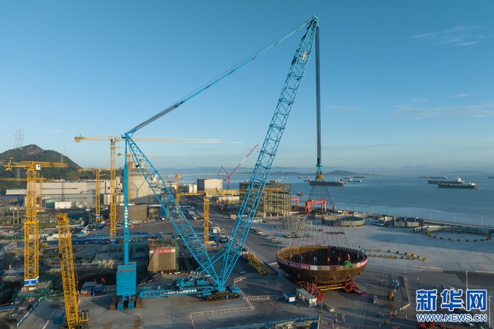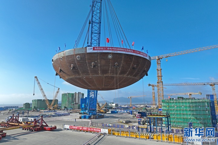 這是5月29日拍攝的三門核電二期工程4號機組核島鋼制安全殼底封頭吊裝現(xiàn)場。新華社發(fā)(潘侃俊 攝)