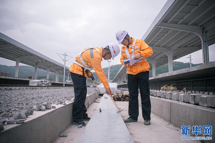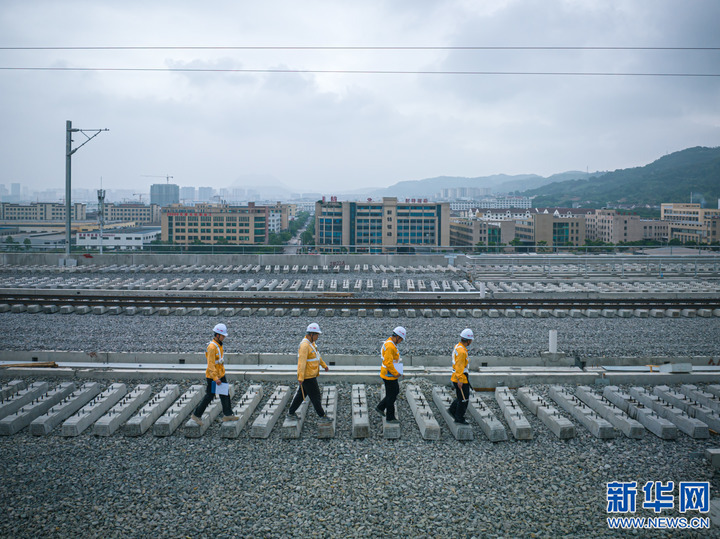 6月1日,寧波工務(wù)段金甬鐵路提前介入組的工人對(duì)建設(shè)中的嵊州站車站附屬設(shè)施進(jìn)行檢測(cè)。新華社記者 江漢 攝