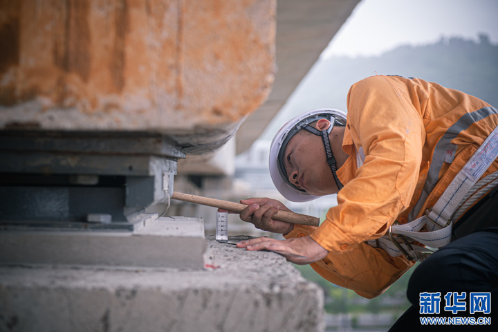 6月1日,寧波工務(wù)段金甬鐵路提前介入組的工人對(duì)新昌江特大橋箱梁進(jìn)行檢測(cè)。新華社記者 江漢 攝