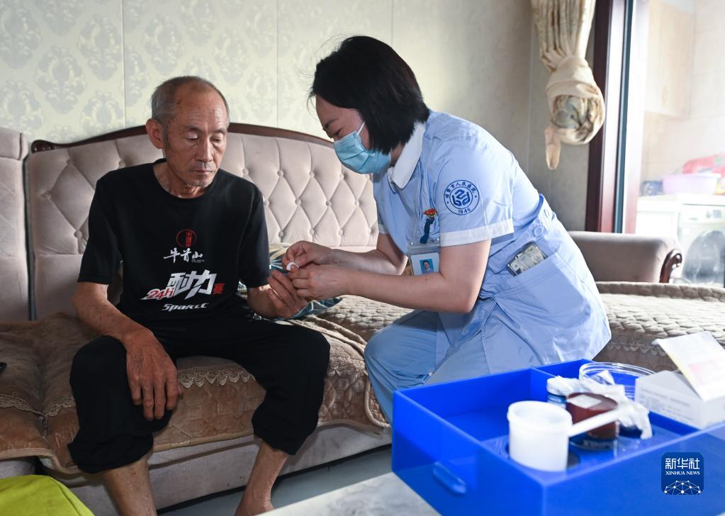 6月7日,諸暨市安華鎮(zhèn)衛(wèi)生院醫(yī)務(wù)人員上門為居民服務(wù)。安華鎮(zhèn)群眾可通過“浙里護(hù)理”平臺網(wǎng)上預(yù)約,享受優(yōu)質(zhì)便利的上門護(hù)理服務(wù)。