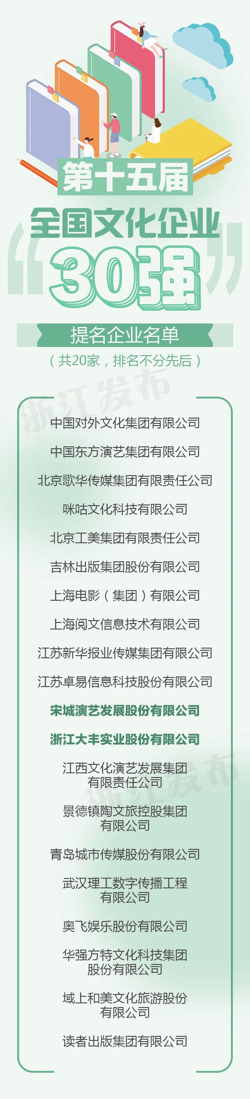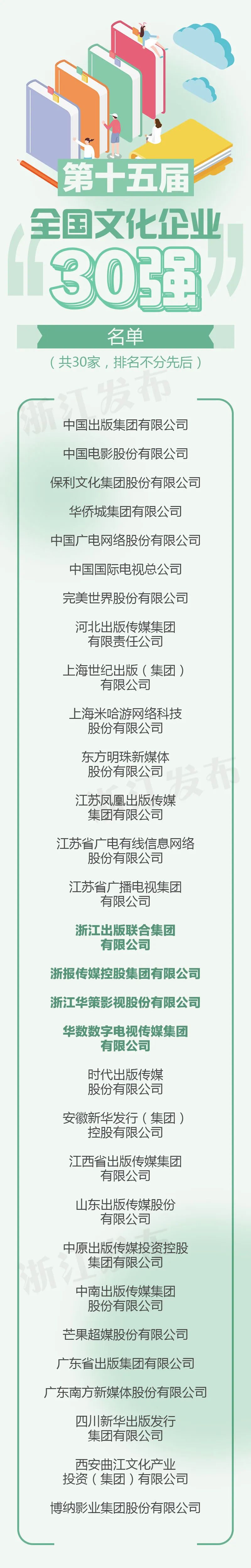 浙江共有浙江出版聯(lián)合集團(tuán)有限公司、浙報(bào)傳媒控股集團(tuán)有限公司、浙江華策影視股份有限公司、華數(shù)數(shù)字電視傳媒集團(tuán)有限公司4家企業(yè)獲評(píng)“全國(guó)文化企業(yè)30強(qiáng)”,宋城演藝發(fā)展股份有限公司、浙江大豐實(shí)業(yè)股份有限公司2家企業(yè)獲評(píng)“全國(guó)文化企業(yè)30強(qiáng)提名”。
