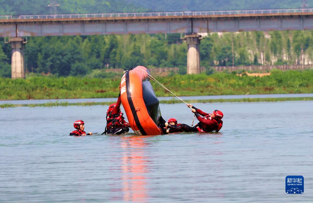 6月9日,在浙江省湖州市長(zhǎng)興縣合溪水庫(kù)煤山段,應(yīng)急救援隊(duì)進(jìn)行水上救援演練。