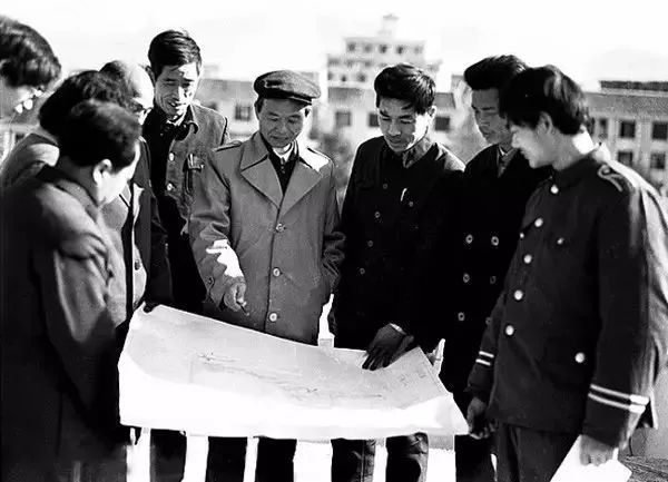 陈定模 (右四) 和同事们在龙港街头研究规划建设。新华网发 萧云集 摄