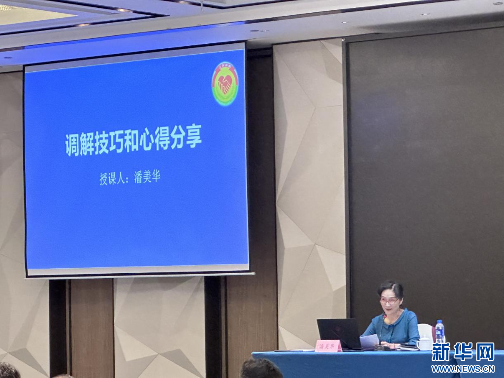 潘美华在调解培训会上为基层调解员传授调解技巧、分享调解心得。新华网发