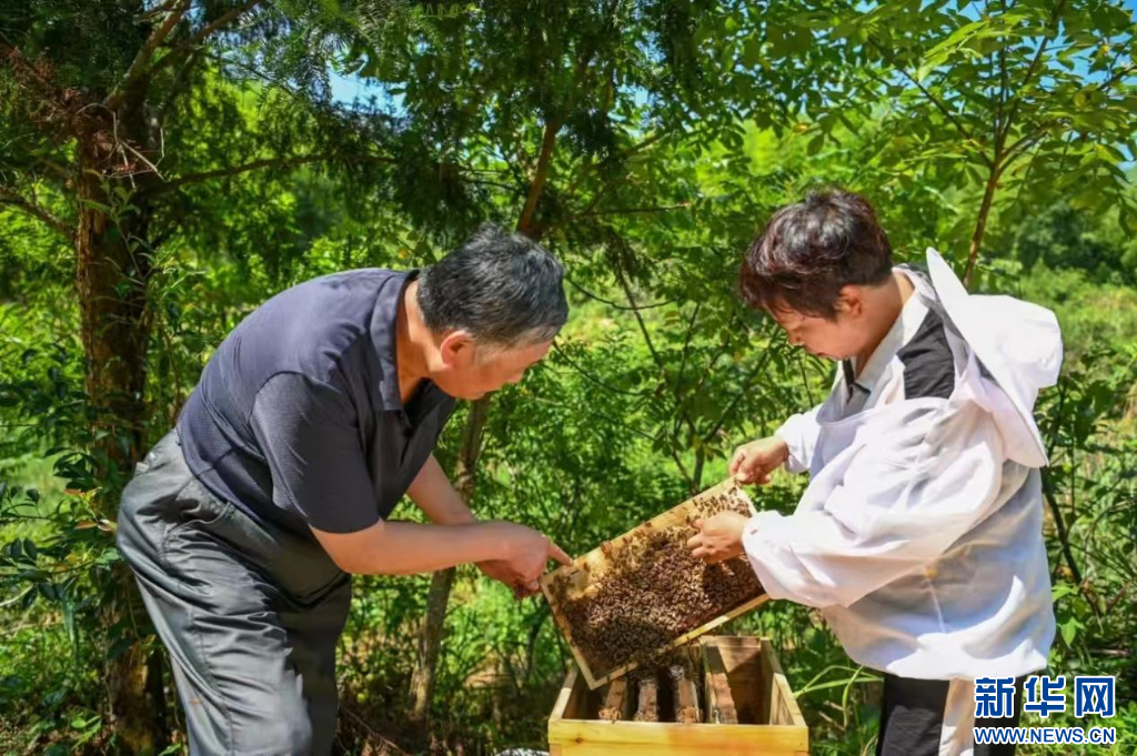 “蜜界达人”王友明(左)在为蜂农讲解中锋养殖技术。新华网发