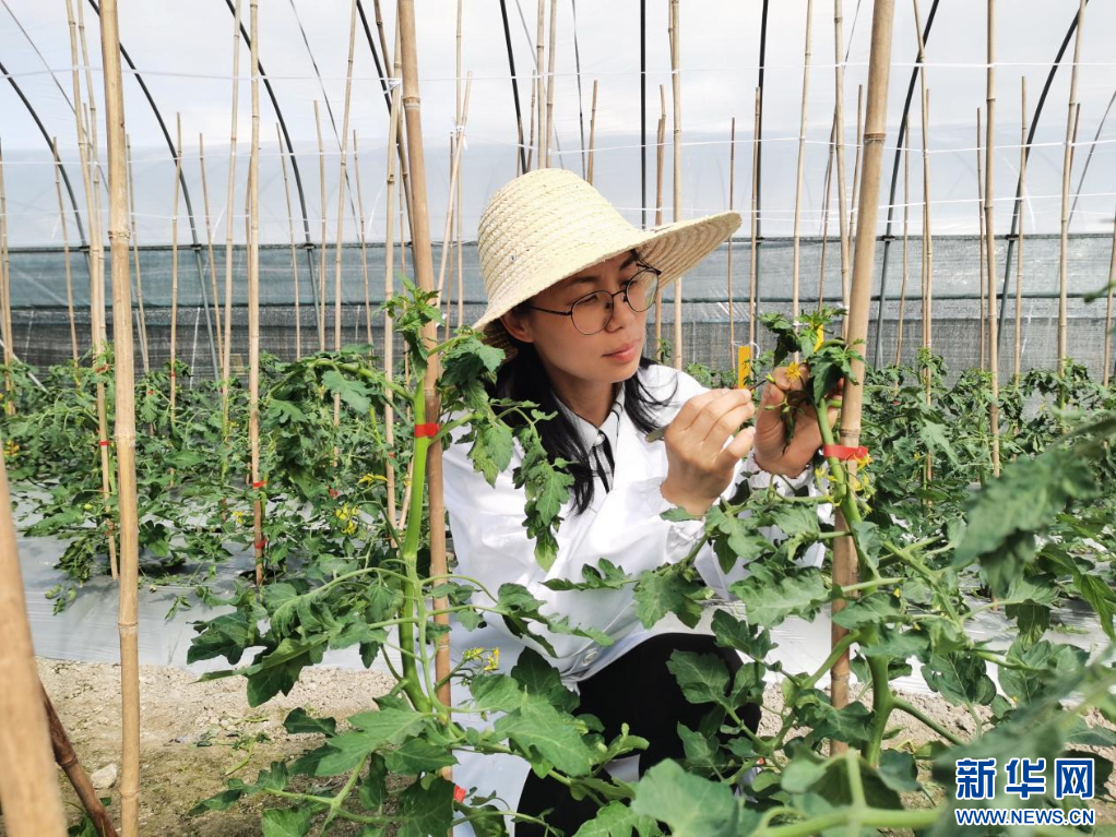 “番茄西施”宰文珊在番茄种植大棚内查看育苗情况。新华网发