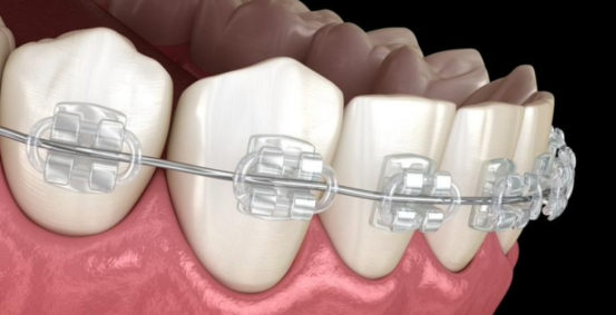 透明陶瓷托槽是由乳白色半透明或完全透明的生物陶瓷材料制作,与牙齿色泽一致。它是由透明的生物陶瓷制作而成,从远处观看只能看到一条钢丝,从而达到“半隐形”的效果,适合对美观度有需求,牙齿矫正难度系数较高的人。优点是价格适中,美观度良好,矫治效率高。缺点是托槽与弓丝之间摩擦力稍大,不利于牙齿的移动,且脆性大,容易损坏。