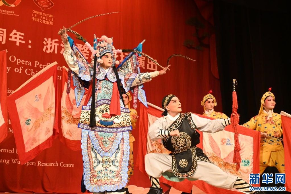 李重均(左一)海外演出婺剧《吕布试马》。新华网发