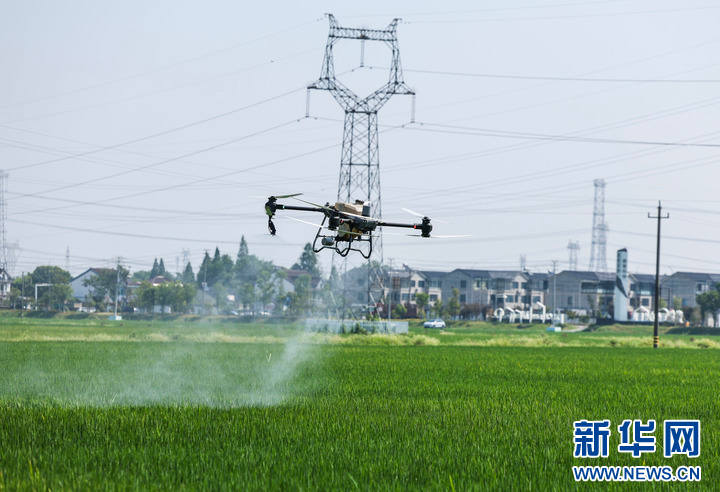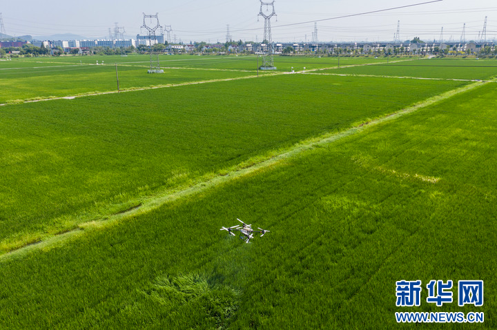 8月6日,在东林镇保国村的稻田里,植保无人机为水稻喷洒叶面肥。新华社记者 徐昱 摄