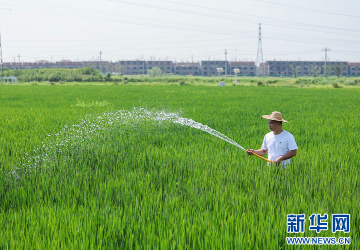 8月6日,在东林镇保国村的稻田里,种粮大户尚年军在给稻田补水。新华社记者 徐昱 摄