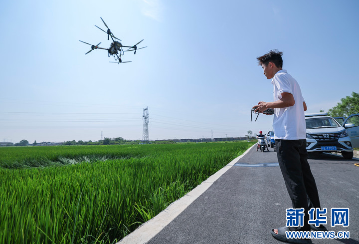 8月6日,在东林镇保国村的稻田里,湖州吴兴稻丰农业公司的植保工作人员操作植保无人机为水稻喷洒叶面肥。新华社记者 徐昱 摄