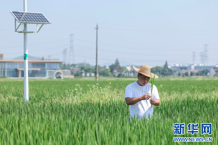 8月6日,在东林镇保国村的稻田里,种粮大户尚年军在查看水稻的长势。新华社记者 徐昱 摄
