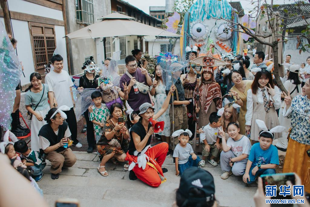 2023年国庆期间,一场浪漫的艺术现场在岩头镇的横街小巷里上演。在新开业的“好消息花园”内,当地的驻村艺人和游客一同带上造型独特的面具,组织了一场盛大的巡游活动。“我仿佛穿越到了另一个梦幻世界,古村的历史韵味与现代艺术融合,令人难以忘怀。”游客李察说。