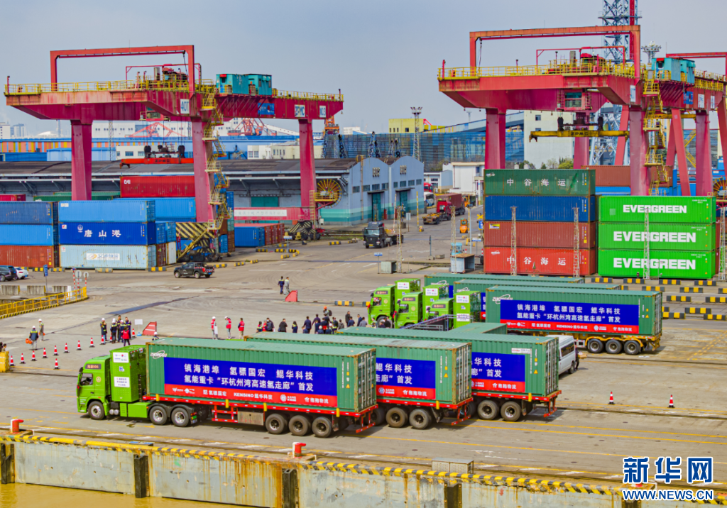 2024年3月26日,氢能重卡“环杭州湾氢走廊”首发仪式在浙江镇海港埠举行。新华网发 浙江鲲华新能源科技有限公司供图