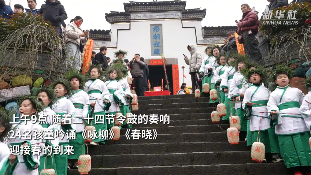 上午9点,随着二十四节令鼓的奏响,24名孩童吟诵《咏柳》《春晓》,迎接春的到来。