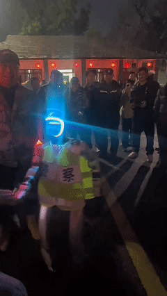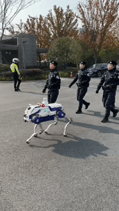 杭州余杭,机器狗跟随警察在街头巡逻。新华网 宋越 摄