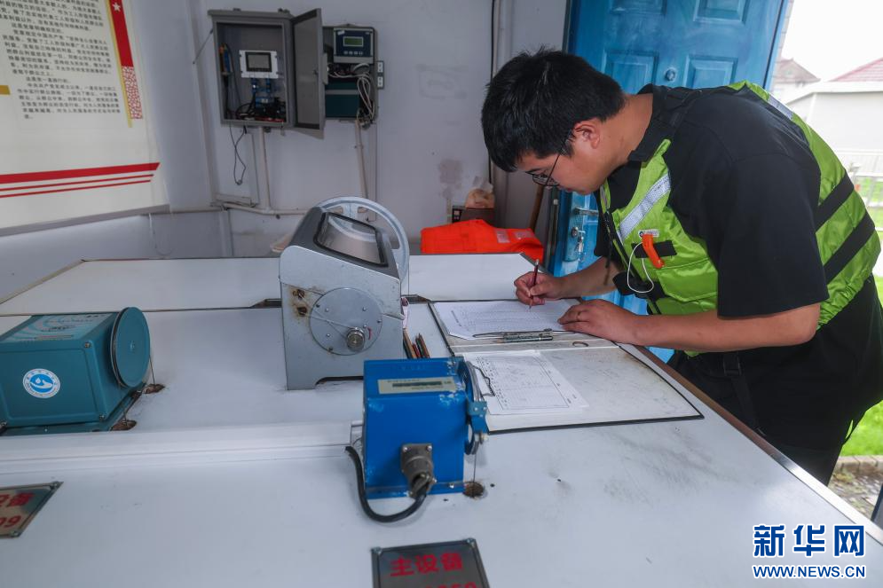 6月11日,嘉兴市南湖区余新镇水位站工作人员记录不同时段的河道水位,确保本轮强降雨期间数据实时回传至防汛指挥系统。