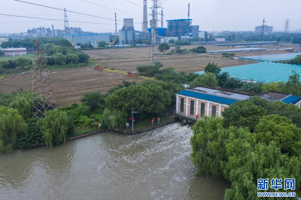 6月11日,嘉兴市南湖区大桥镇十八里圩区夏义港泵站在排涝(无人机照片)。