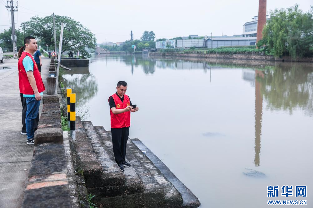 6月11日,嘉兴市南湖区余新镇党员干部巡查重点河段水位情况及堤岸稳固性。