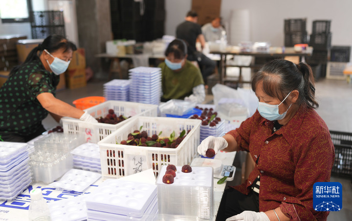 6月17日,在黄岩澄江街道的共富工坊,农户将新鲜采摘的东魁杨梅过秤分装。
