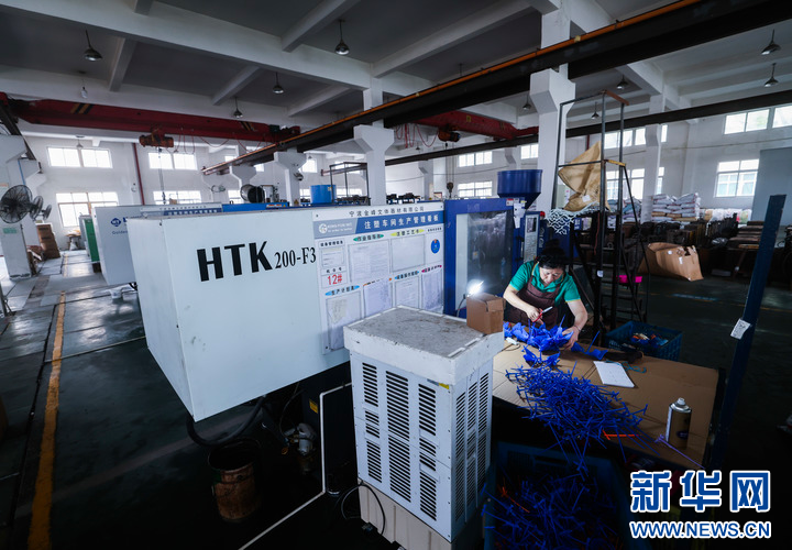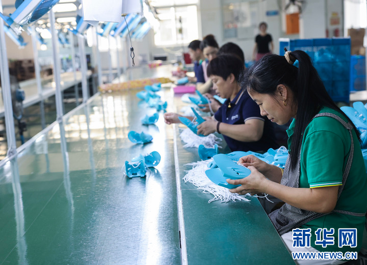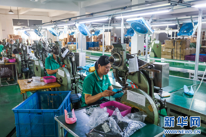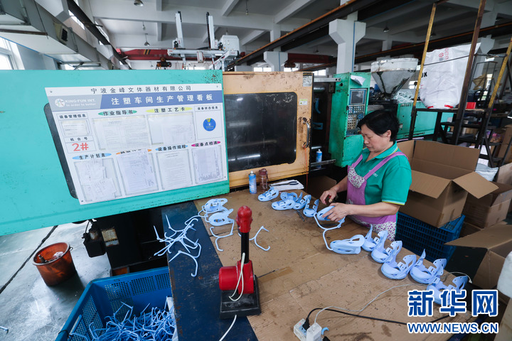 6月25日,工人在宁波金峰文体器材有限公司车间内加工出口的轮滑鞋。