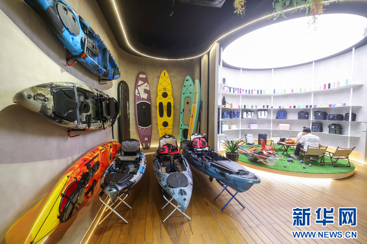 位于慈溪市的浙江酷尔智能科技有限公司的展厅内展示公司生产的各类皮划艇及相关户外用品(6月25日摄)。该公司生产的皮划艇主要出口欧美市场,同时国内需求也在快速扩大。